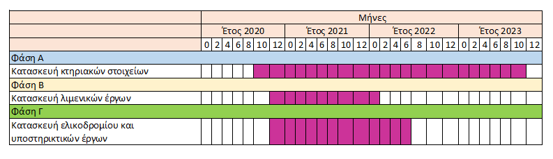 Η κατασκευή του έργου θα γίνει σε τρείς φάσεις για την ελαχιστοποίηση των περιβαλλοντικών πιέσεων προς το φυσικό περιβάλλον της περιοχής. Οι φάσεις Α, Β και Γ ανταποκρίνονται στην ομαδοποίηση των επιμέρους κατασκευαστικών στοιχείων του έργου.
